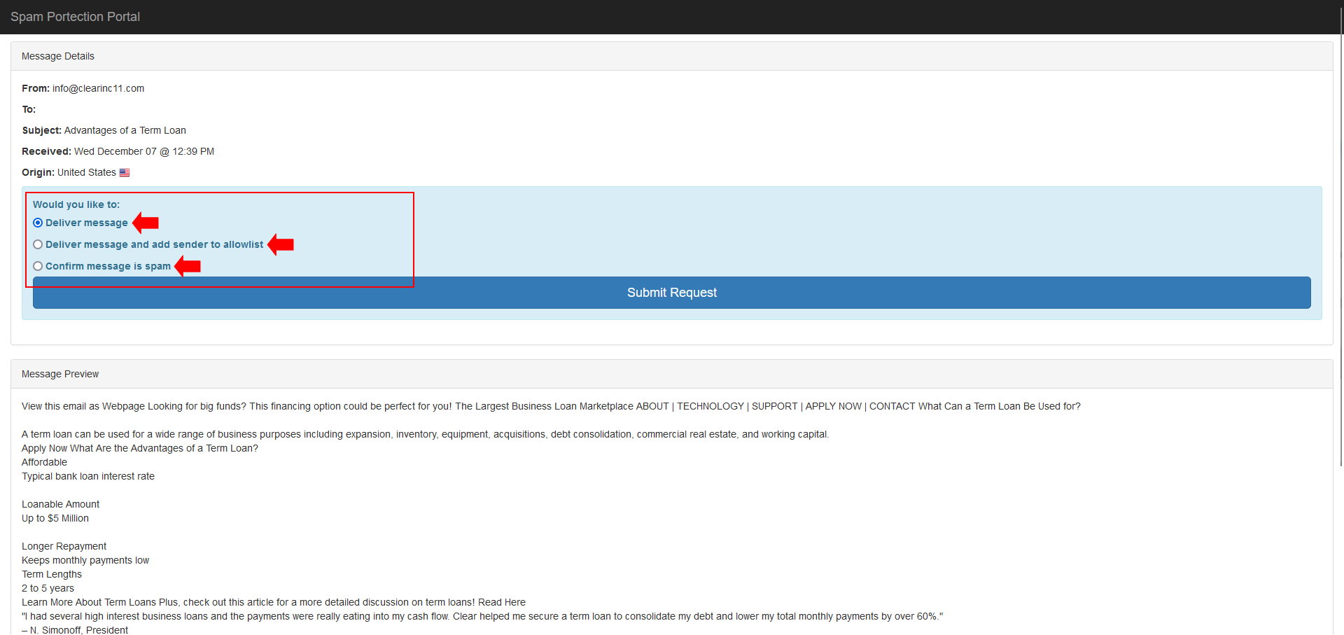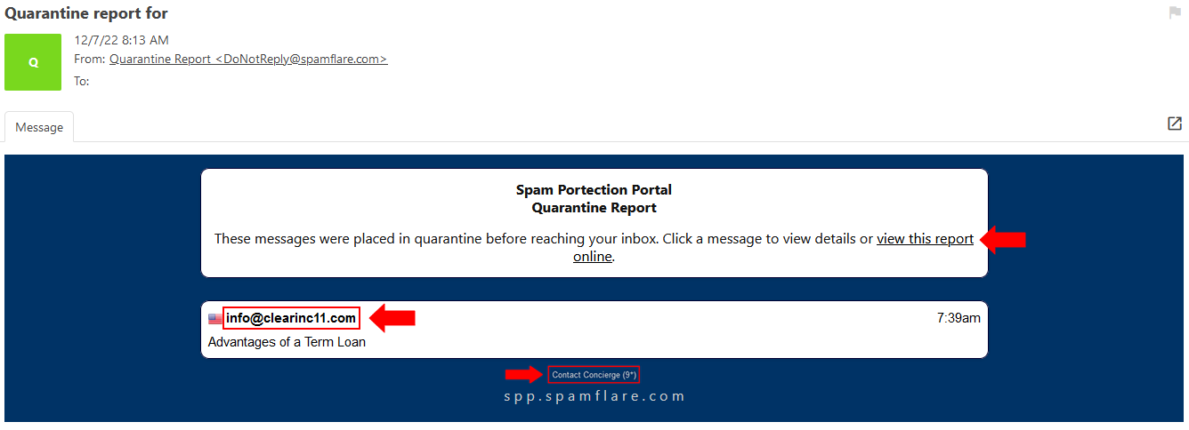 Releasing Quarantined Emails: When you click on the senders email address in the quarantine email, it will open a web browser window, providing you options for that specific email. These options are shown in the image below. If the email is from someone you trust, select the option that says, "Deliver message and add sender to allowlist". This will allow that senders emails to freely pass through the system, so make sure you trust the sender when selecting this option. The "Deliver message" option will deliver the email to your inbox, but will not mark the sender as trusted. It will most likely get caught in the spam filter again. The "Confirm message as spam" option just confirms the filtering choice and will keep the email sender as spam. Please continue to the next section to learn how the Contact Concierge will help to keep your trusted senders from ending up in the quarantine.