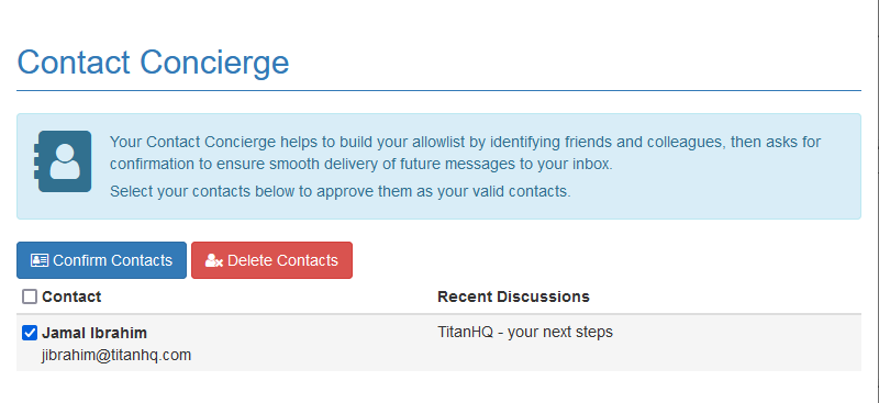 Contact Concierge: At the bottom of the quarantine email, you will sometimes see a link that may say "Contact Concierge (?+)" (shown in first image above). The contact concierge will show you a list of contacts that have emailed you multiple times and made it through the spam filtering without issues. If you click the link in the quarantine email, it will open a web browser window, like shown in the image below. Select some or all of the contacts, by checking the box to the left and click Confirm Contacts. This will place the contacts on your allowlist. If a contact is listed that you do not want to place on your allowlist, you can select the checkbox and select Delete Contacts.