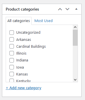 Navigate to the Product categories meta box. Here you will select BOTH the manufacturer of the building and the state it is located in.