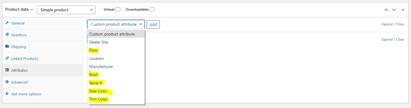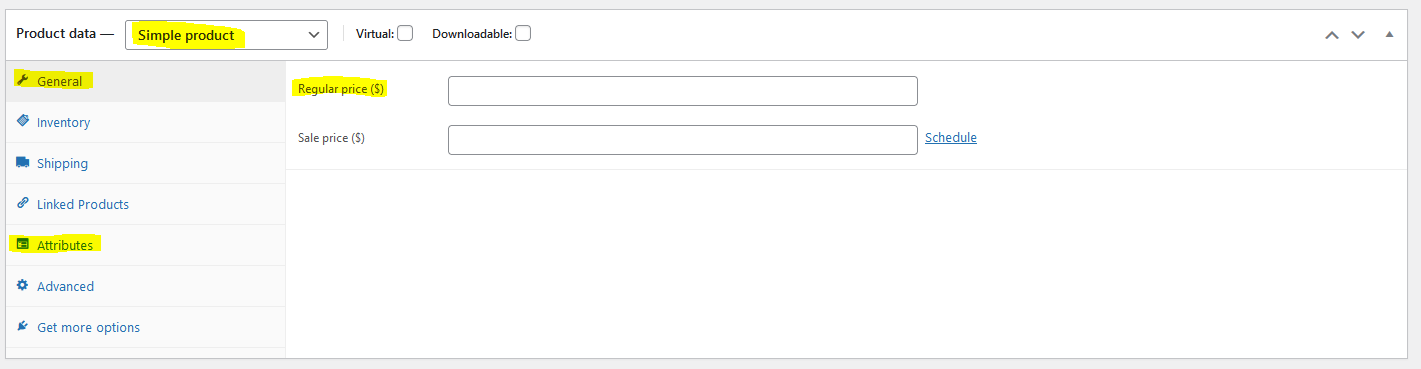 Go to the Product Data meta box (scroll down on the page), and make sure Simple product is selected. You will want to go to the General and Attributes tabs to fill in information. The Product data meta box is where the majority of important data is added for your product.