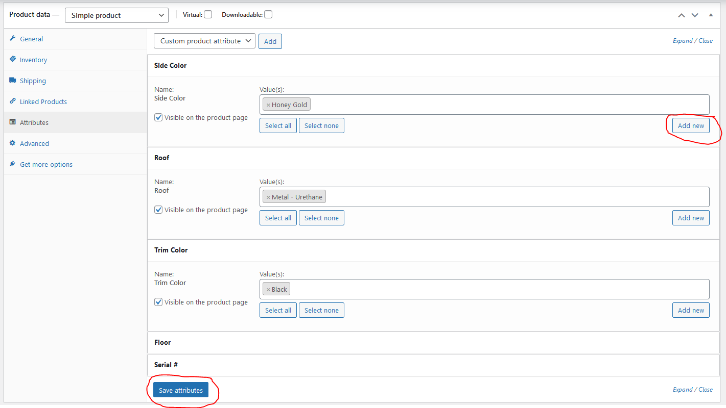 Once you have added all 5 attributes, you will then proceed to enter the information in the Value(s): box for each attribute. You will notice when you click one the Value(s): box some options already appear to select from. This is because it saves the attribute values used by previous buildings. If the value is there, select it, if not, you can click the Add new button (circled in image below), to enter a new value. Once all attributes are complete, you MUST click on the blue Save attributes button to save your attributes (circled in image below).