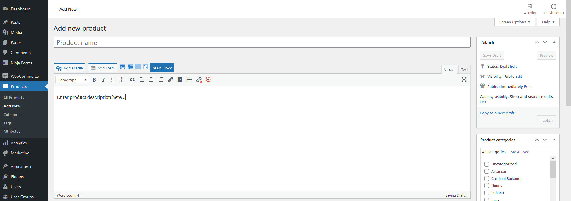 Skip the Product short description meta box. Now you will to look on the right-hand side of the page. You will see small meta boxes labeled (top to bottom) Publish, Product categories, Product tags, Product image and Product gallery.